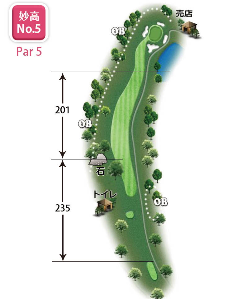 1番パー5と9番パー4がオーソドックスでタフ、 その他のホールはすべて面白い。3番パー4は変則型 「ケープ」のティショットで始 まり、第2打はショートアイアンの打ち上げ。5番パー3は「レダン」の形状にオーガ スタ並みの池が絡む。ここに映る妙高は逸品である。8番パー5はバックからでも 480ヤードしかないが、短いロングホールの見本で、第2打の左ドッグレッグからは 頭脳プレーとショットの正確性がテストされる。特にグリーン周辺は要注意である。